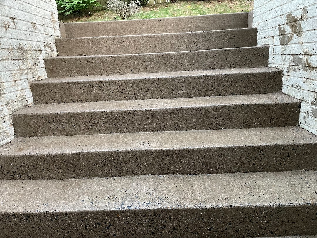We started with the house, applying our eco-friendly algicides and cleaning solutions that work at the molecular level to eliminate growth at its source. Then we turned our attention to the hardscaping, carefully treating the basement walkout entrance, front sidewalk, and curbing with appropriate methods for each surface.